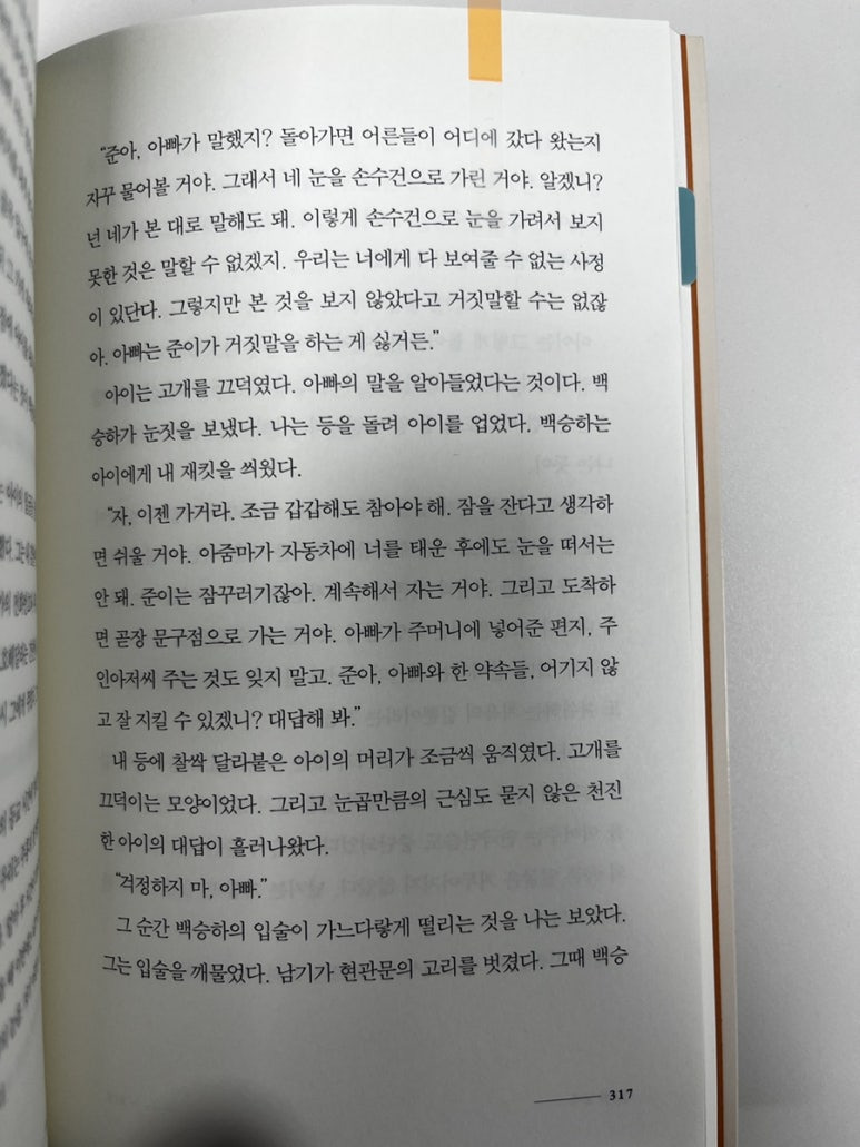 준이는 어렸다. 그저 아버지가 시키는 말을 철없이 따르는, 세상의 잔혹함을 모르는 순수한 아이였다. 그런데 그 어린아이가 아버지를 위로한다. “걱정하지 마, 아빠.” 이 말은 단순한 대사가 아니었다. 세상에 대한 두려움조차 알지 못하는 순수한 아이가, 두려움과 절망으로 부들부들 떨고 있는 어른을 오히려 다독이는 장면이었다. 그 짧은 대사 하나가 마음을 후벼판것만 같았다. 소설 속의 인물들조차도 그 감정에 사로잡혔겠지만, 그 순간 나는 독자의 입장이 아니라, 그 자리에 함께 있는 사람처럼 마음이 무너졌다.