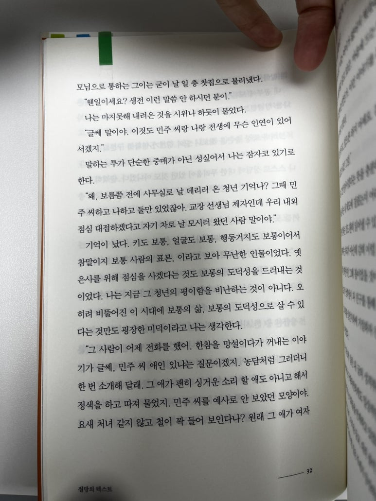 읽으면서 불현듯 그런 자문이 머릿속을 가득 채웠다. 나 역시 때로는 바쁘다는 이유로, 혹은 눈에 띄고 싶지 않다는 이유로 기본적인 도덕을 소홀히 한 적은 없었을까. 혹시 나도 모르게 이 시대의 혼탁함에 무뎌져 무언가를 그냥 넘겨버리지는 않았을까. 이 작품은 단지 주인공의 삶을 따라가는 데에서 그치지 않고, 독자로 하여금 자신의 삶을 되돌아보게 만든다. 그것이 이 소설의 깊은 힘이자, 읽는 이로 하여금 사유하게 만드는 이유라고 생각한다.