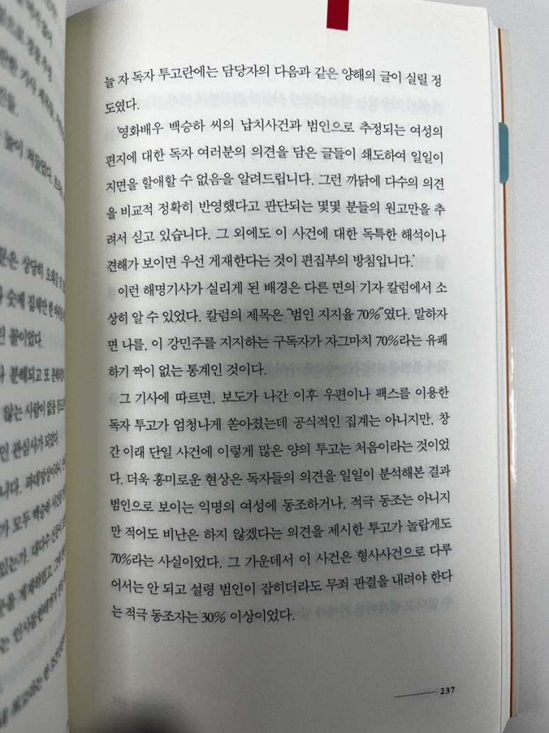 “그 기사에 따르면, 보도가 나간 이후 우편이나 팩스를 이용한 독자 투고가 엄청나게 쏟아졌는데 공식적인 집계는 아니지만, 창간 이래 단일 사건에 이렇게 많은 양의 투고는 처음이라는 것이었다. 더욱 흥미로운 현상은 독자들의 의견을 일일이 분석해본 결과 범인으로 보이는 익명의 여성에 동조하거나, 적극 동조는 아니지만 적어도 비난은 하지 않겠다는 의견을 제시한 투고가 놀랍게도 70%라는 사실이다. 그 가운데서 이 사건은 형사사건으로 다루어서는 안 되고 설령 범인이 잡히더라도 무죄 판결을 내려야 한다는 적극 동조자는 30% 이상이었다.”