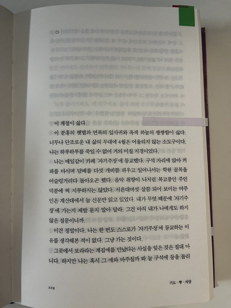 이토록 예쁘게 표현해 놓고도 봄이 싫다니… 나는 봄이 제일 좋은데. 내가 가장 사랑하는 계절. 나를 너무나도 설레게 하는 계절. 이 계절은 나에게 설렘을 안겨주는 계절인데. 우연이는 싫어한다. 그런데 '이 분홍빛 햇살과 연둣빛 잎사귀, 옥색 하늘의 쨍쨍함이' 라고 말하며 그렇게나 아름답게 봄을 표현하는 우연이. 그럼 우연이가 좋아하는 계절은 언제일까? 단조로운 우연이의 삶. 어느 계절이 과연 단조로울까? 사계절 모두가 반짝반짝 자기 주장이 강한데.히히