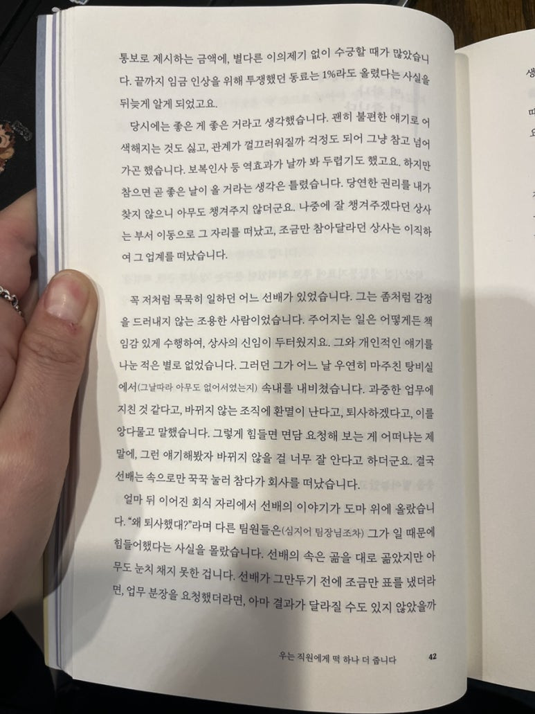 책의 이야기에 빠져들어 어느새 뒷부분을 더 읽고 싶어지게 된다. 특히, ‘나 00회사에 스카웃 됐어. 더 좋은 데로 간다, 됐냐!’라는 문장을 읽고 나서는 통쾌하고 기분이 좋아졌다. 내가 경험하지 못한 회사의 분위기와, 여전히 회사 내에서는 누가 어떤 라인인지, 학교 등이 중요한 문화가 있다는 사실을 알게 되면서 그 문장이 너무나도 시원하게 느껴졌다.