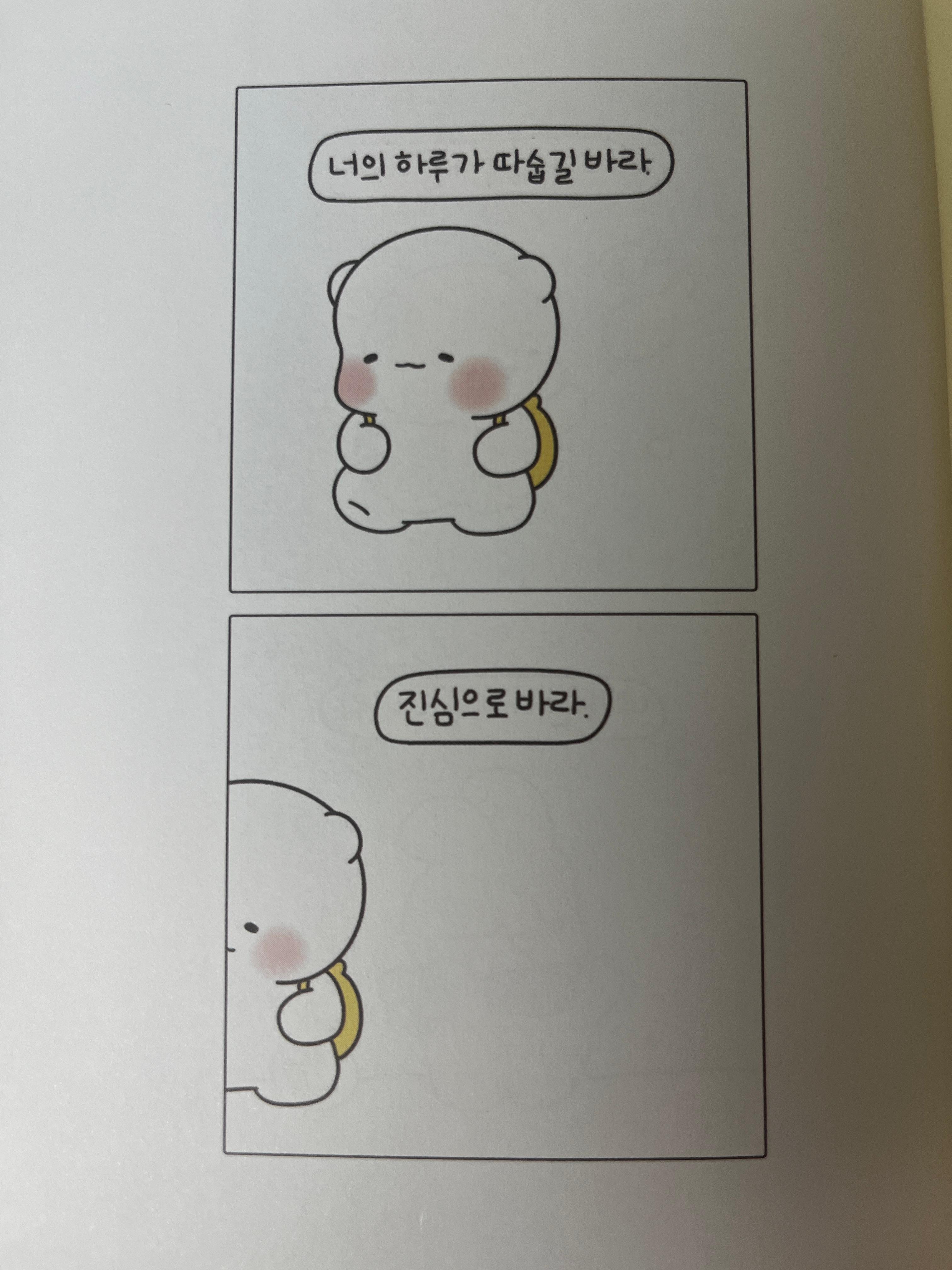 다시 취업을 하고 정신없이 하루하루를 보내며, 계속해서 내가 하고 있는 일이 맞는 건지 의심하게 되는 순간이 많았다. 그런 때에 우연히 발견한 책이 바로 고은지 작가의 《너의 하루가 따숩길 바라》보게 되었고 단순히 표지가 귀엽고, 부담 없이 읽을 수 있다점으로 인해 구입을 하였던 책.