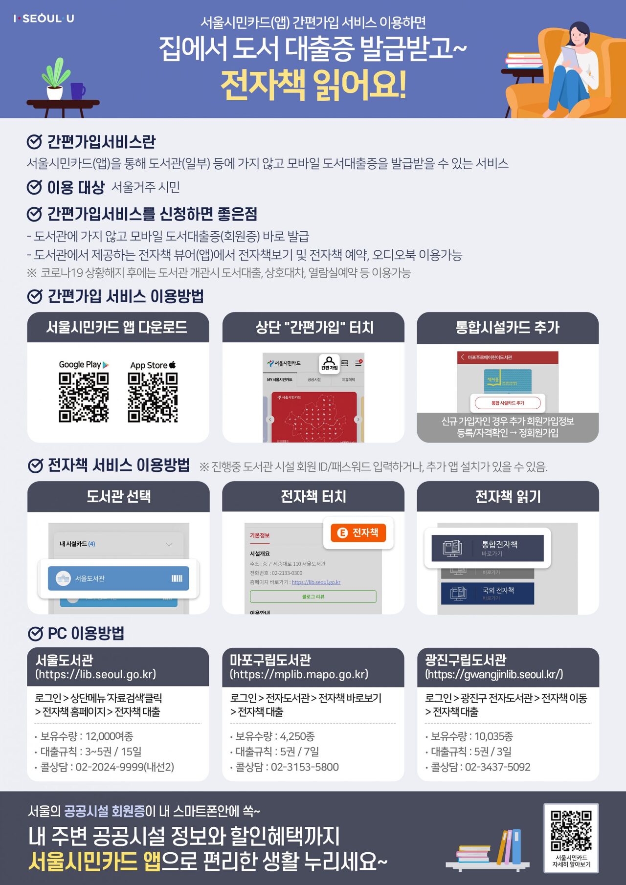 서울시민카드 앱을 설치하고 가입을 하게 되면 서울시에 있는 모든 도서관을 개별로 가입 없이 이용이 가능하다고 하더라고요~