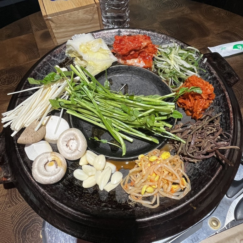 고기를 주문하면 이렇게 판위에 각종 야채랑 버섯을 올려주는데요~