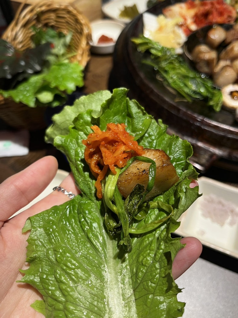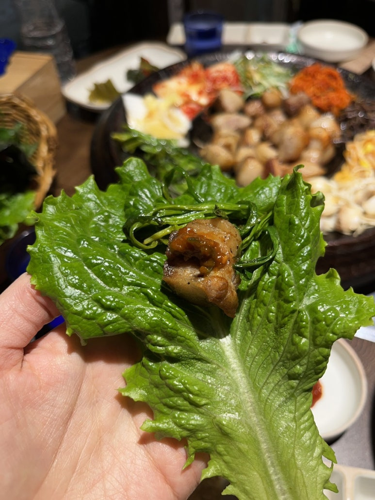 상추에 미나리 그리고 고기에 쌈장 살짝 올려서 먹었는데 이렇게 먹으니 더 맛있었어요! 역시~ 고기에는 미나리가 조합이 정말 좋은 거 같아요!