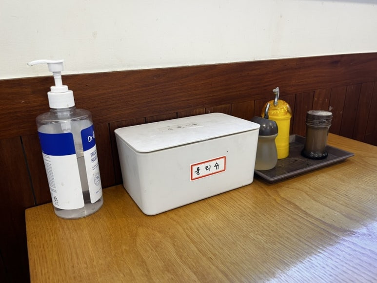 테이블에 물티슈랑 후추 식초 등이 구비되어 있고요!