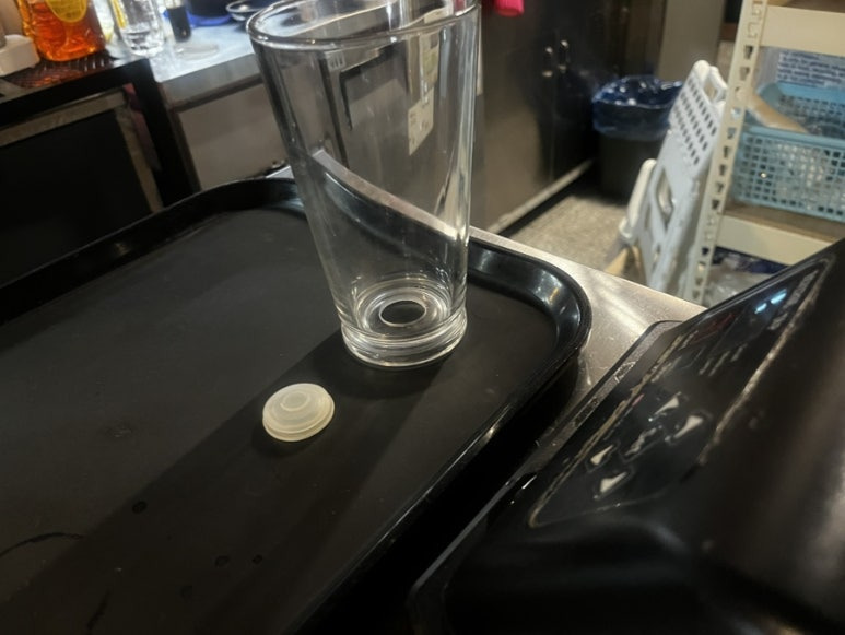 그래서 나갈 때 물어보니 이렇게 구멍이 뚫린 컵에 저 마개를 끼우고 기계 위에 올려두면 생맥이 만들어지더군요~