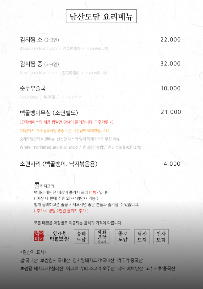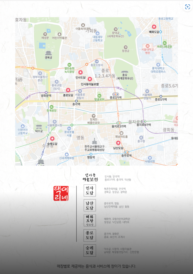 인사동 마늘보쌈 숭례도담 남산도담 혜화도담 종로도담 택대리네 입니다.