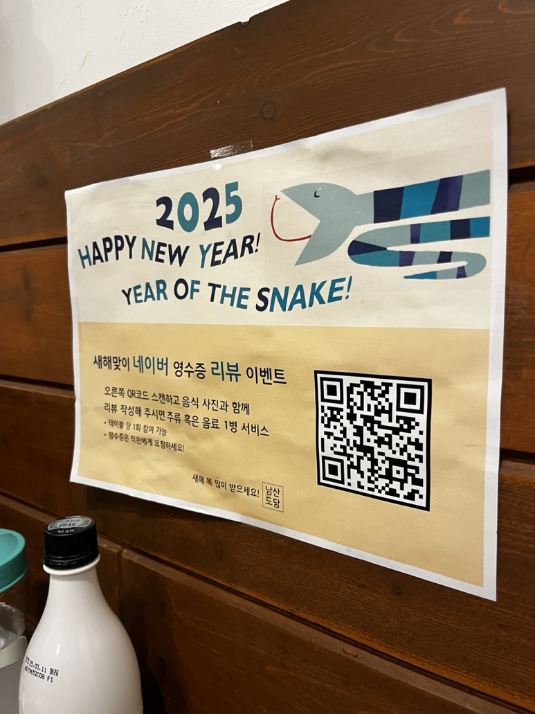 QR 코드 스캔하고 음식 사진과 함께 리뷰 작성하시면 주류 혹은 음료 한 병 서비스니 참여하셔서 맛있는 막걸리 한 병 받아 가시면 되겠죠?ㅎ