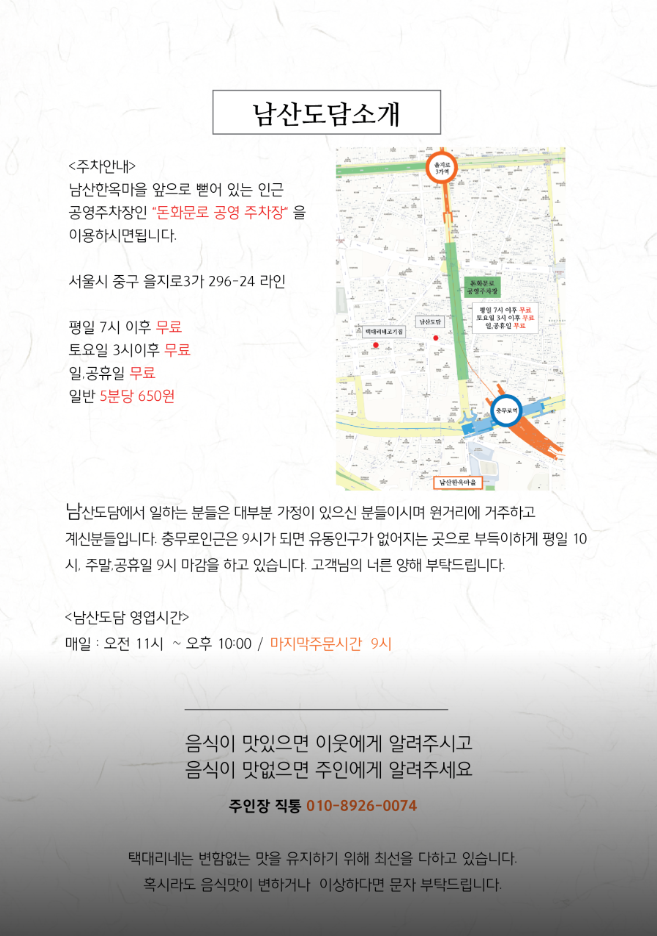 남산도담은 충무로역에서 도모 5분 정도 거리에 위치해있습니다.