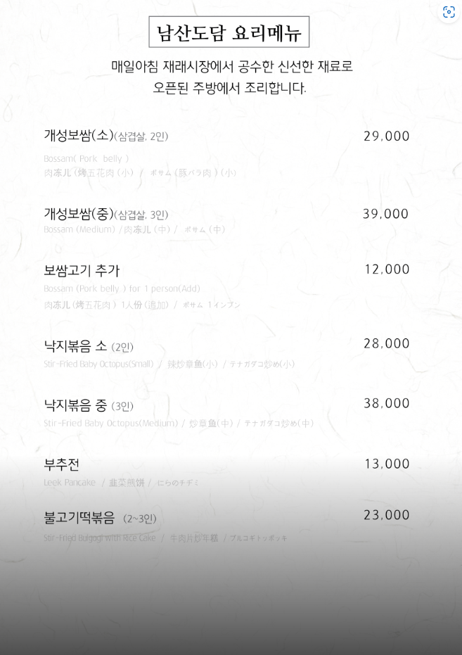 충무로역 혹은 을지로3가역에 회사가 많기도 하고 저는 회식 장소 고를 때 고기를 구워주거나 제가 굽지 않아도 되는 족발 보쌈 이런 메뉴를 선호했어요!ㅎㅎ 아무래도.. 고기를 잘 구우면 좋으나! 잘 못 구우는 분들도 많으니까요(이거 내 얘기.. ㅎ) 남산도담은 보쌈, 김치찜, 낙지볶음 등 굽지 않아도 되는 음식이니까요~헤헤