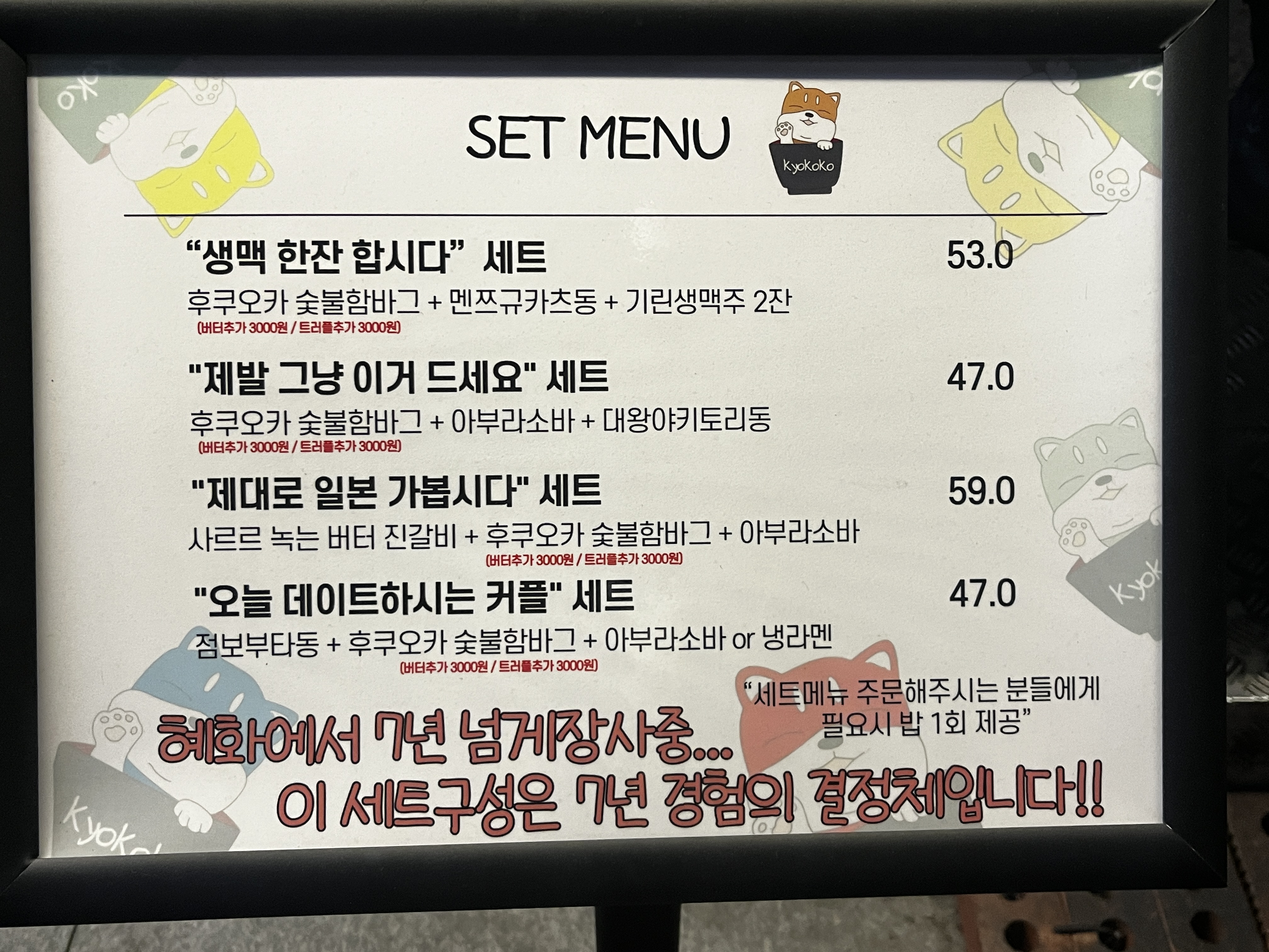 쿄코코 대학로점은 혜화에 상주한 지 벌써 7년이나 된 맛집이라고 합니다. 편안한 가격과 품격 있는 밤집 겸 술집으로 유명하다고 하는데요.