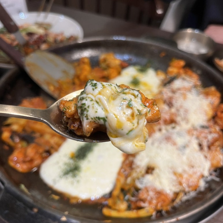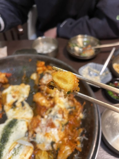 치즈 추가해서 그런지 치즈 양이 정말 많았고! 치즈에 닭갈비 한 점 찍었는데~ 치즈가 정말 쭉 늘어나서 너무 좋았어요!ㅎㅎ