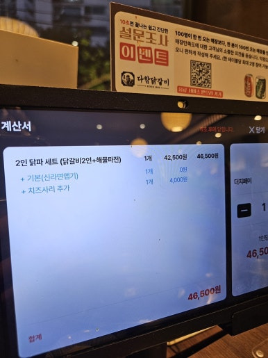 메뉴를 찬찬히 보고 2인 닭파 세트(42,500원)에 치즈 사리 추가(4,000원) 했어요!