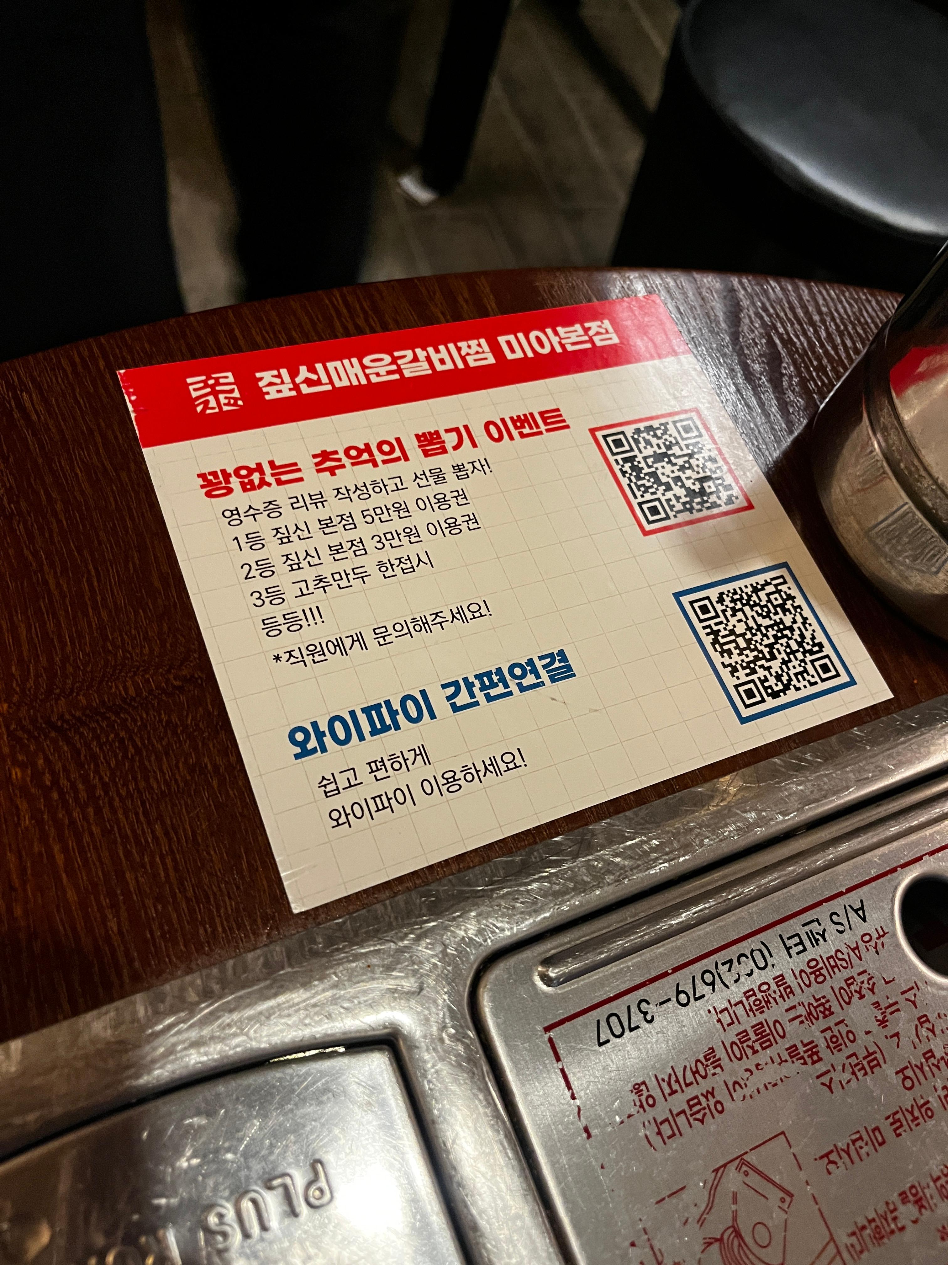 식당에 간혹 있긴 한데~ 짚신매운갈비찜 미아본점은 손님들은 위해 와이파이도 쉽게 연결할 수 있게 QR로 만들어놔서 너무 좋은 거 같아요!
