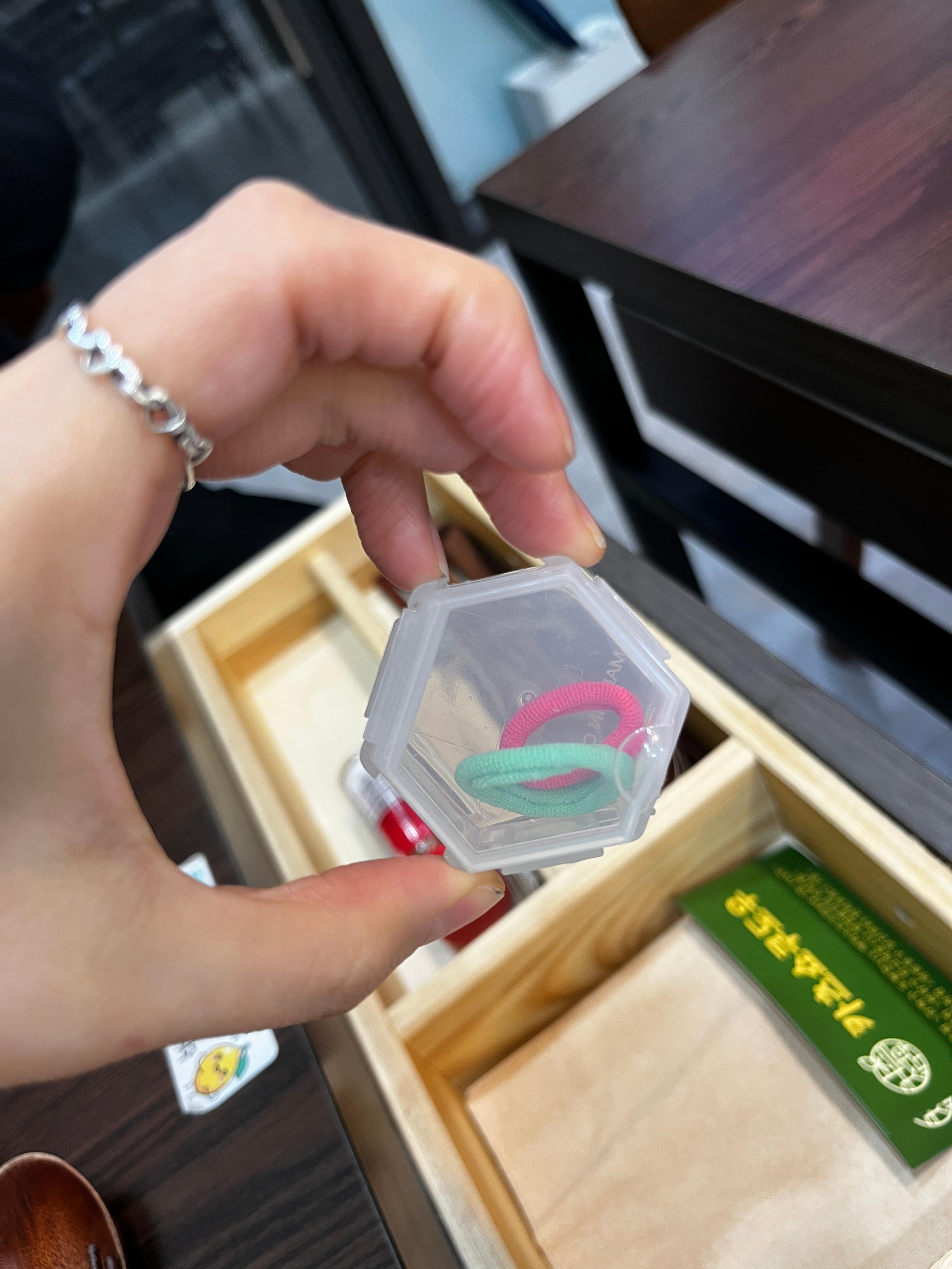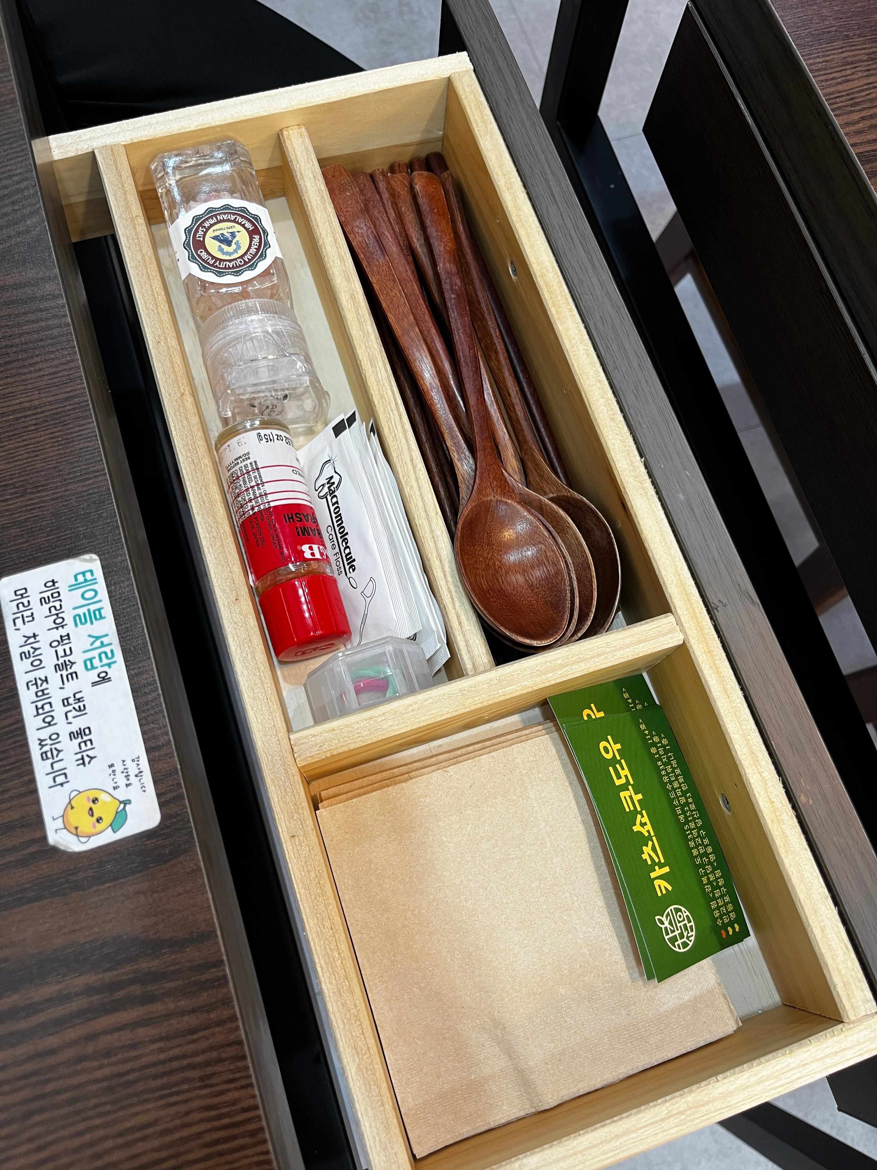테이블 서랍 안에 머리끈, 치실, 히말라야 핑크 솔트, 냅킨 등이 있는데요.