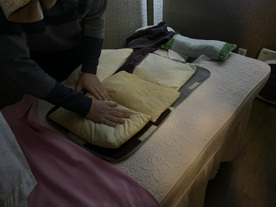 공기압찜질은 콩이랑 녹두가 들어간 찜질기를 따뜻하게 만들어서 등이랑 배에 올려두고 몸에 안 좋은 독소가 빠지게끔 하고 다리 마사지기기를 사용하는데요.