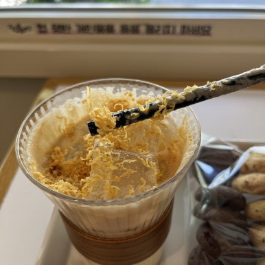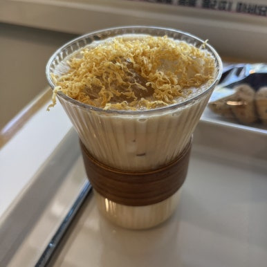 얼롱라떼는 디카페인 커피를 베이스로 하고, 그 위에 브라운 치즈가 올라간 라떼예요.