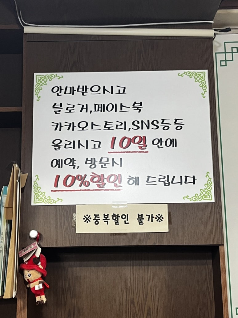 공무원 복지포인트를 사용할 수 있고, 사회서비스 안마 바우처 제공 기관으로도 등록된 믿을 수 있는 기관이에요. 또한, 안마를 받으신 후 네이버 블로그, 페이스북, 카카오스토리, 인스타그램 등 SNS에 후기를 올리시고, 10일 이내에 재방문 예약을 하시면 10% 할인 혜택을 준다고 하니 재방문하실 예정이라면 꼭 참고하세요!