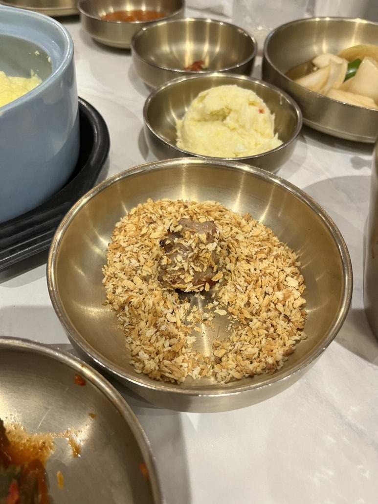 물어보니 고기가 구워지면 튀김가루를 찍고 소스를 찍어 먹으면 돈가스처럼 먹을 수 있다고 합니다.
