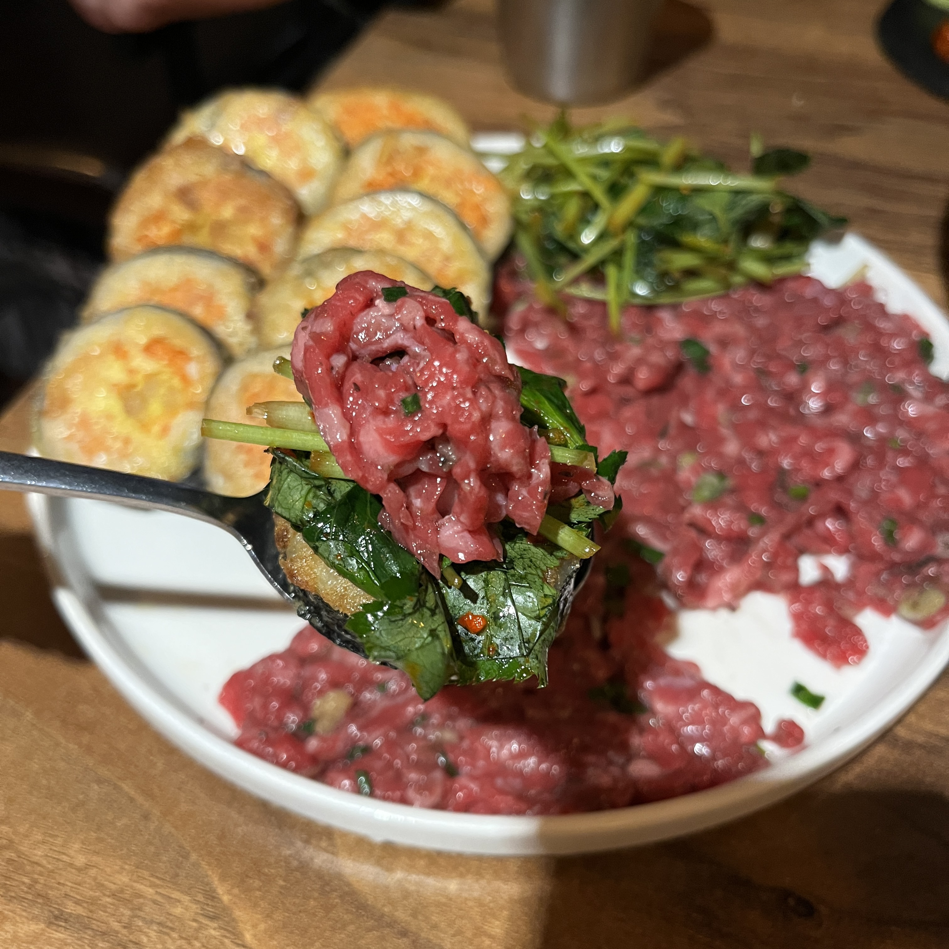 김밥에 야채 살짝 올리고 그 위에 육회를 올려서 먹었는데요.