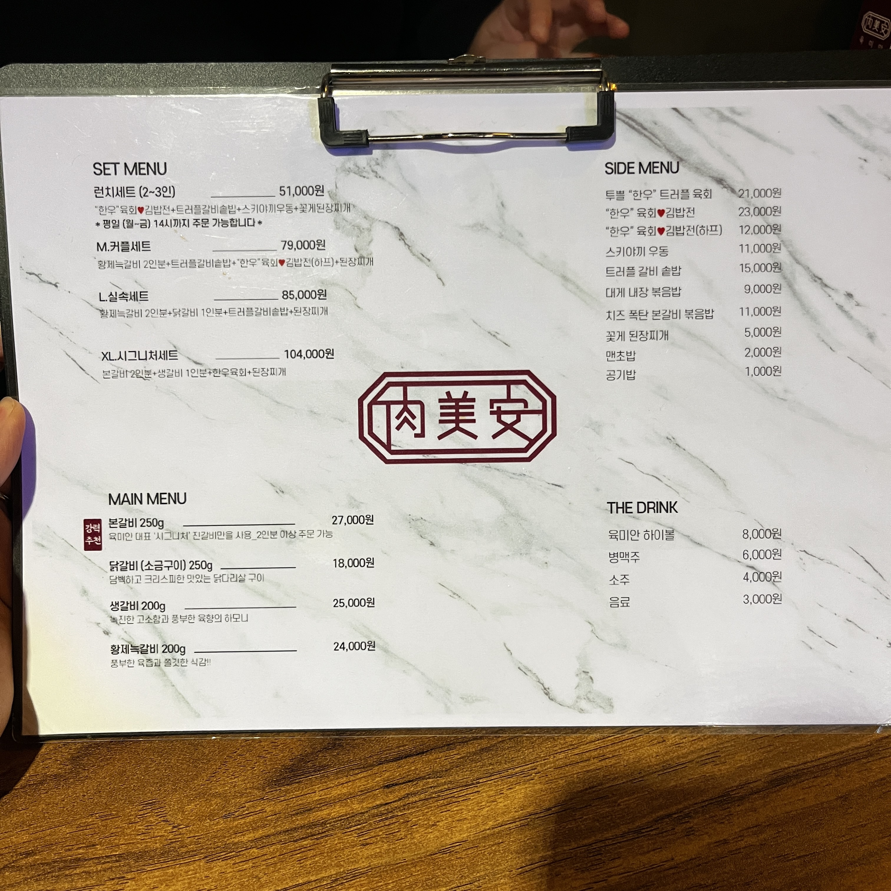 메뉴를 보고 뭐 먹을지 너무 고민이 돼서 주변을 둘러보니 다들 본갈비에 술 한잔씩들 드시고 있었어요. 아무래도 대표메뉴가 본갈비다 보니 다들 본갈비를 드시는 거 같았어요! 그래서 저희도 본갈비 2인분(54,000원)을 주문하고 한우 육회 김밥전(23,000) 하나, 육미안 하이볼 2잔(16,000원)도 주문했습니다.