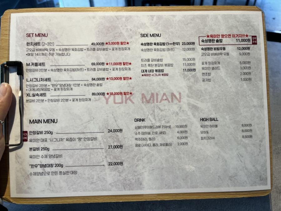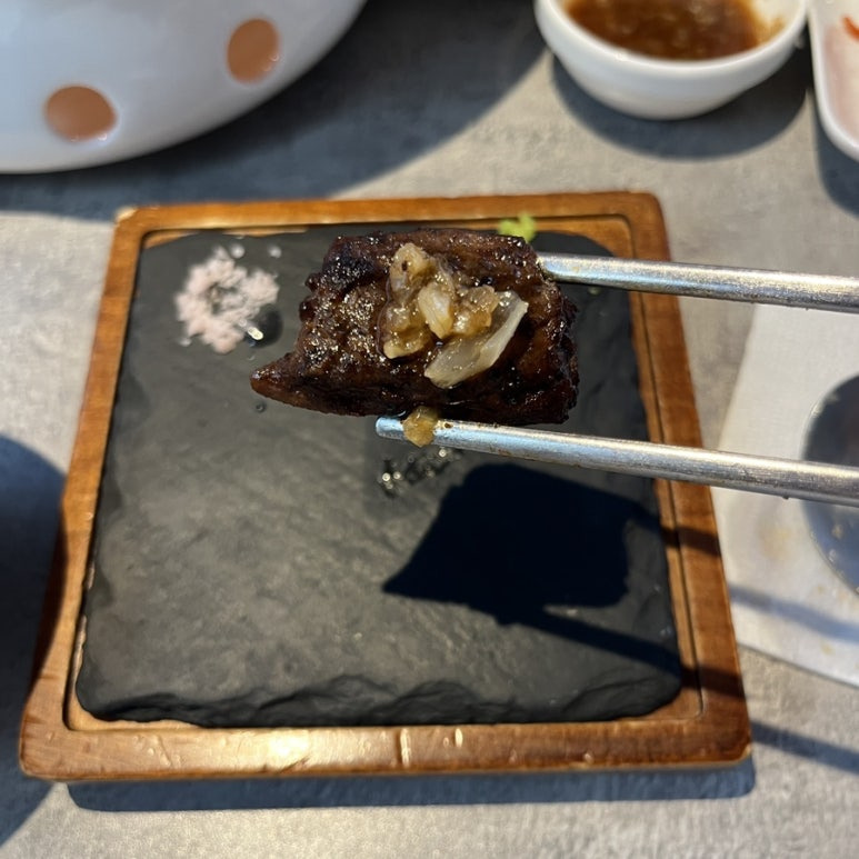 안창 갈비는 처음에는 와인 소금에 찍어서 먹고 그다음에 육미안에서 알려주는 맛있게 먹는 조합이랑 먹으면 좋을 것 같아요!