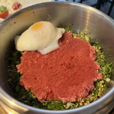 명란이 많이 들어있어서 비리지 않을까 걱정했는데 세발나물이 있어서 느끼하지 않게 먹을 수 있어요!