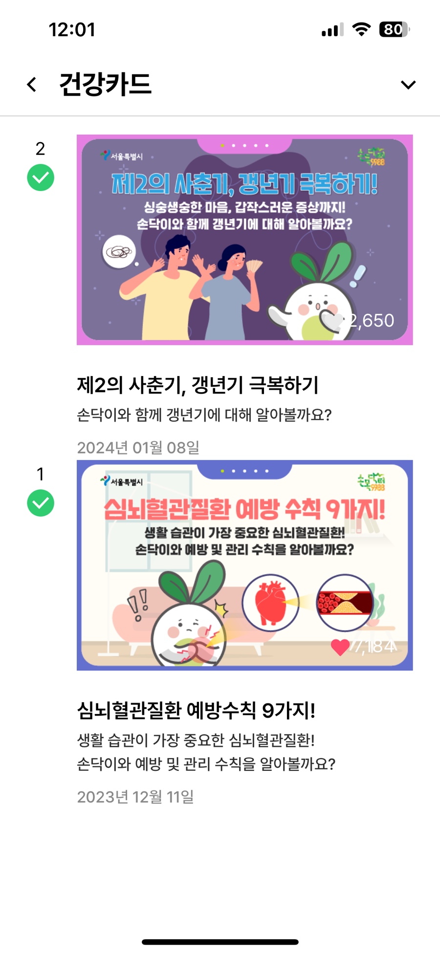 건강 카드는 매일매일 뜨는 게 아니라 가끔 하나씩 뜨는데 건강 카드에 들어가서 내용을 보고 퀴즈를 맞히면 포인트가 지급됩니다. 많이 있으면 좋았을텐데..
