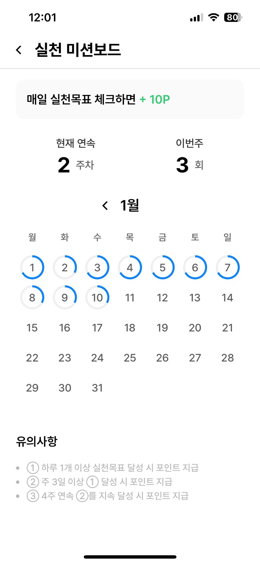 실천 미션은 본인이 목표를 정하고 하루 1개 달성하면 포인트가 지급되니 꼭 실천하고 포인트를 지급받는 게 좋습니다.