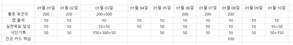1월 1일부터 1월 10일까지의 내역을 보기 쉽게 엑셀로 정리했습니다. 생각보다 많이 들어왔어요. 특히 주 3회 실천을 하게 되면 추가 지급이 되는데 이점이 매우 좋은 같다. 그러니 꾸준히 하면 저보다 많이 벌 수 있으니 열심히들 해보시면 좋을 것 같습니다.