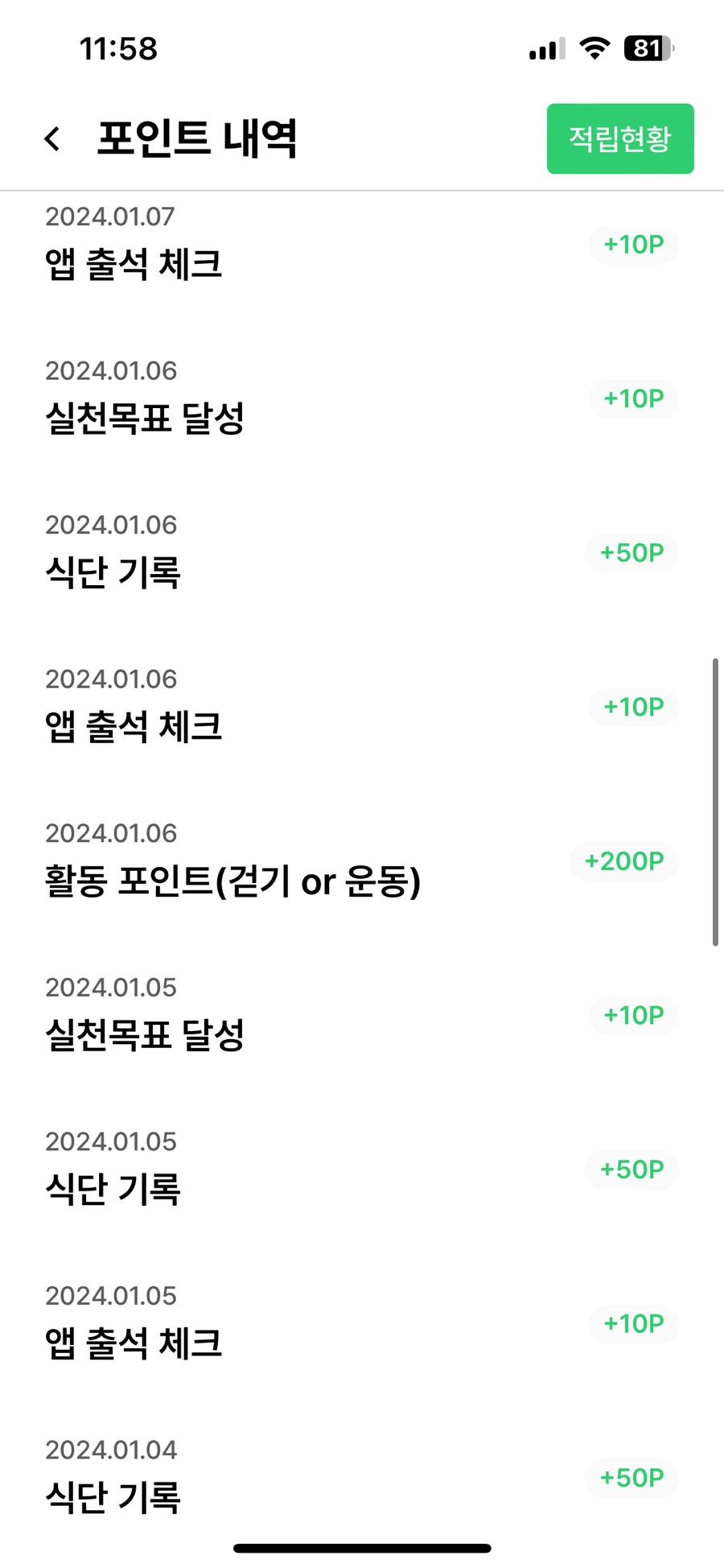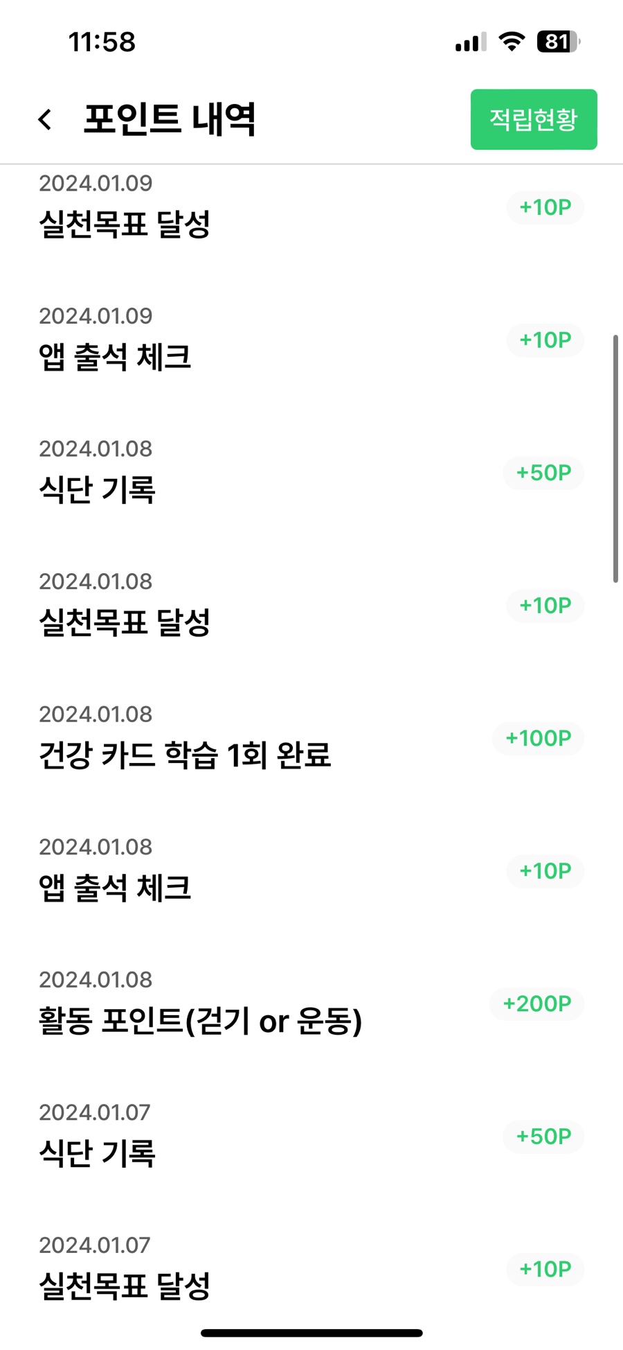 1월 1일부터 1월 10일까지의 적립 내역입니다.
